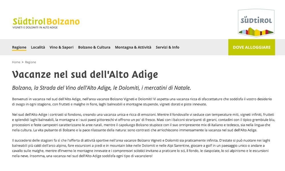 SÜDTIROL ERWARTET SIE MIT SEINEN HERRLICHEN STÄDTEN, WEINBERGEN UND DOLOMITEN! EIN URLAUB VOLLER EMOTIONEN, UM IHNEN ERHOLUNG UND WOHLBEFINDEN ZU JEDER JAHRESZEIT ANZUBIETEN. LASSEN SIE SICH VON DEN BLÜHENDEN OBSTGÄRTEN UND ALMEN, BADESEEN UND SCHÖNEN BERGEN, GOLDENEN WEINBERGEN UND SCHNEEBEDECKTEN HÄNGEN ÜBERRASCHEN.